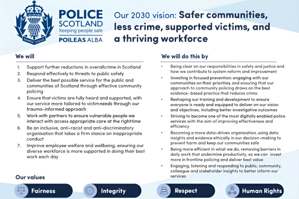 This asset, and significant supporting data and information from engagement, formed a foundation for Police Scotland’s 3-year Business Plan published in September 2024. Alongside this, we clarified: